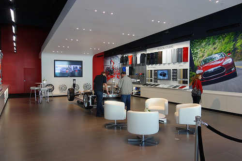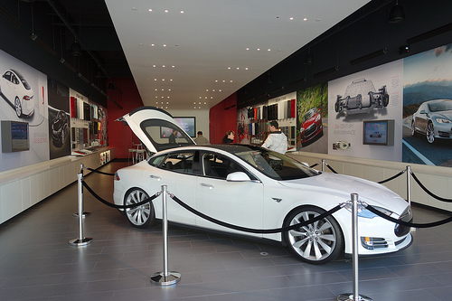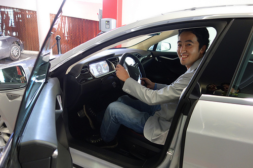 日本では2013年夏から発売予定とのことですが、サンディエゴ三田会の某氏のお陰で試乗に同乗させてもらえることになったので、La Jolla UTCのテスラにふらっといってきたよん。我がRady Schoolの卒業生も何人かテスラに勤めているらしい。