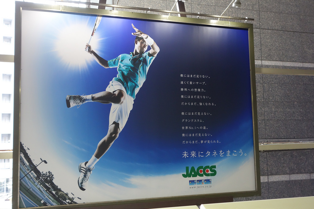 錦織といえば、日本ではこんな駅広告が掲出されていたらしい。なんてことのないイメージ広告なのだが、これを観たとき僕は大きな違和感を持った。何に違和感かというとキャプテン翼ばりに高く舞ったエアK(死語)ではなく、そのコピーだ。