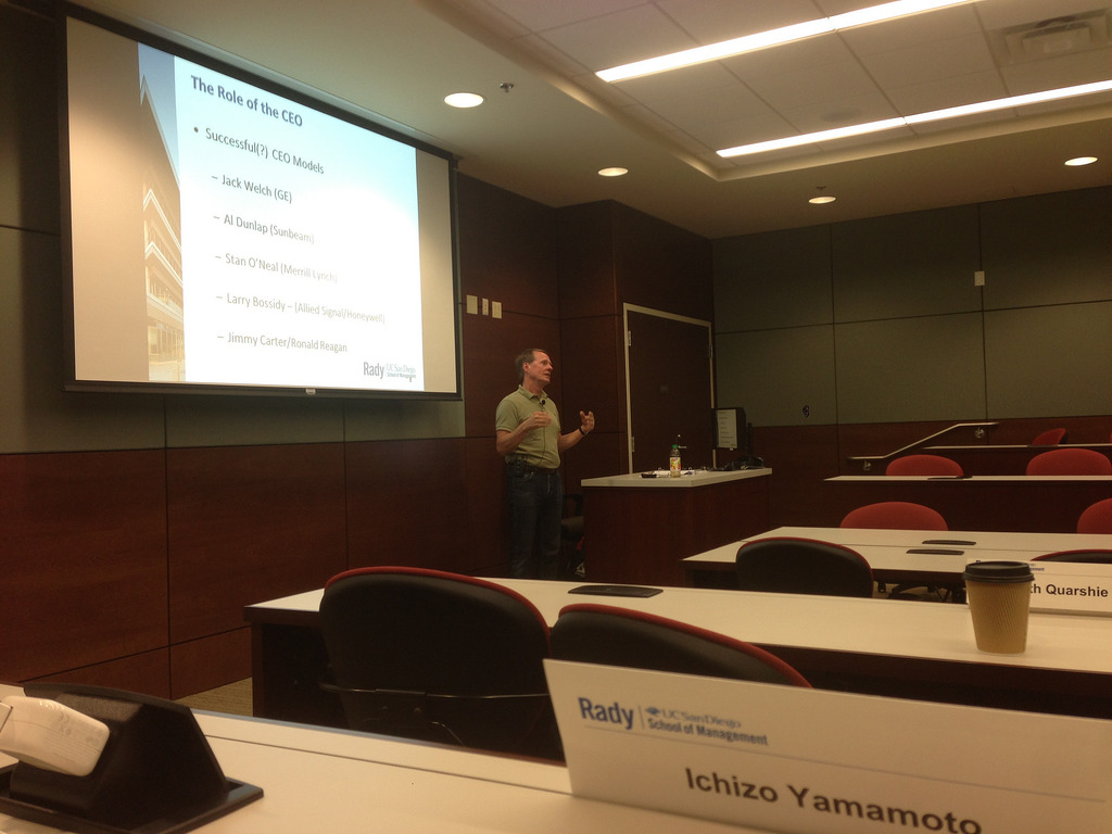 MBAの授業で満足度が高いクラスの特徴は個人的には二極化していて、ひとつは忠実にセオリーをなぞってくれる優等生的タイプの授業と、もうひとつはカリキュラムを無視して担当講師が自分の経験を語ってぶっ放してくれるタイプ。本コースは後者に属し、大抵生徒の質問によって大幅に方向がズレていく。ヒットマンに狙われた話とか、仲間がインサイダーで捕まった話とかが一番記憶に残っている。講師は日本の会社にも詳しく、オリンパスの不祥事やソニーの分離上場提案等ももちろん、キヤノンが御手洗さんを再び戻した話とかも僕より詳しかったりしてタジタジ。